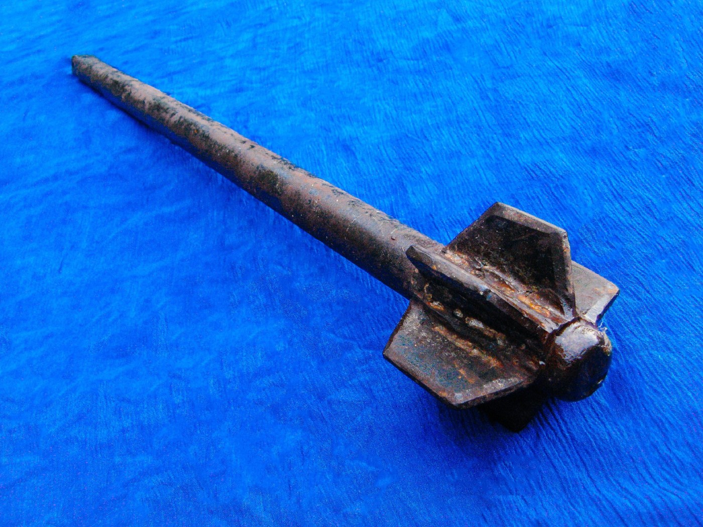 I used a piece of an old model A axel for the shaft. The mace itself is pretty much a basic mace. It’s really really heavy. Maces were used from way back when people first started using metal (thus replacing the early wooden club). For instance, a ‘morning star’ was a wooden club with metal spikes through it that was commonly used by the Swiss in about the twelve hundreds.